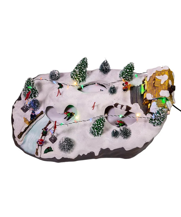 Bring the snowy slopes into your home this holiday with Motion LED Christmas Skiing Village from Kurt Adler. This piece features a house at the top of the slope with skiers ready to head down the slopes. Along the sides are various Christmas trees covered in snow. When activated, the string of lights along the trees and houses light up and the skiers start to move.
