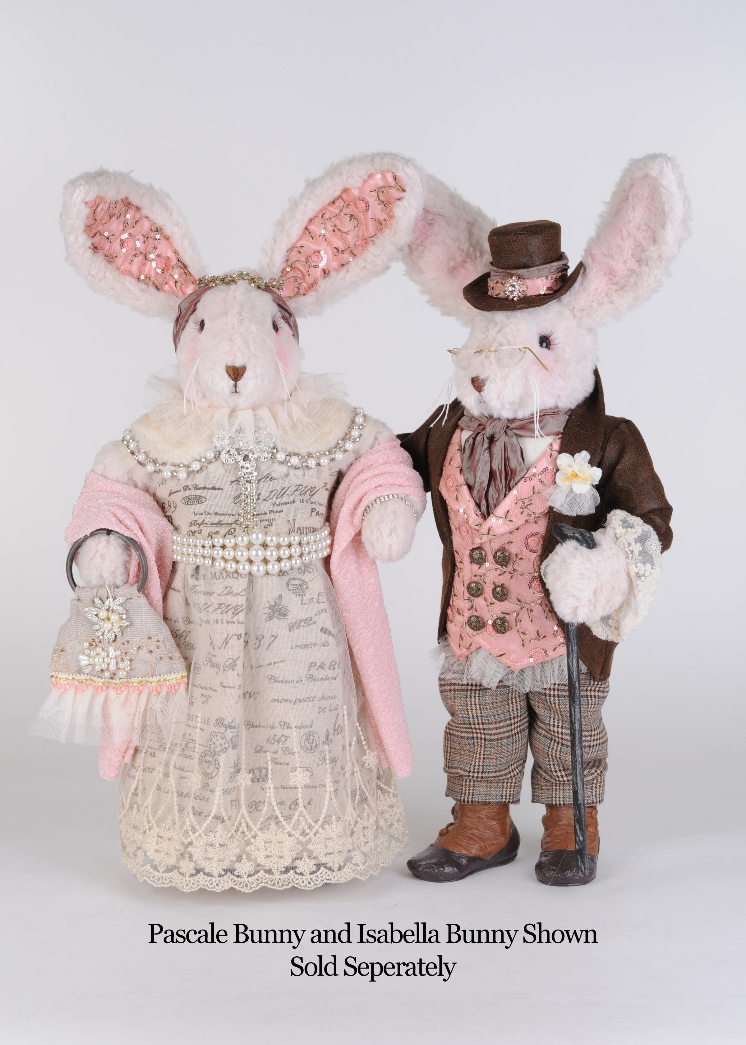 Blush pink accents—including a cozy shawl, softly blushed ears lined with shimmering fabric, and a coordinating headpiece—bring warmth and femininity to the design. In her paw, she carries an ornate handbag adorned with lace, pearls, and floral embellishments, completing the ensemble with couture-like detail. Plush textures and subtle facial features give this bunny a serene, elegant presence.