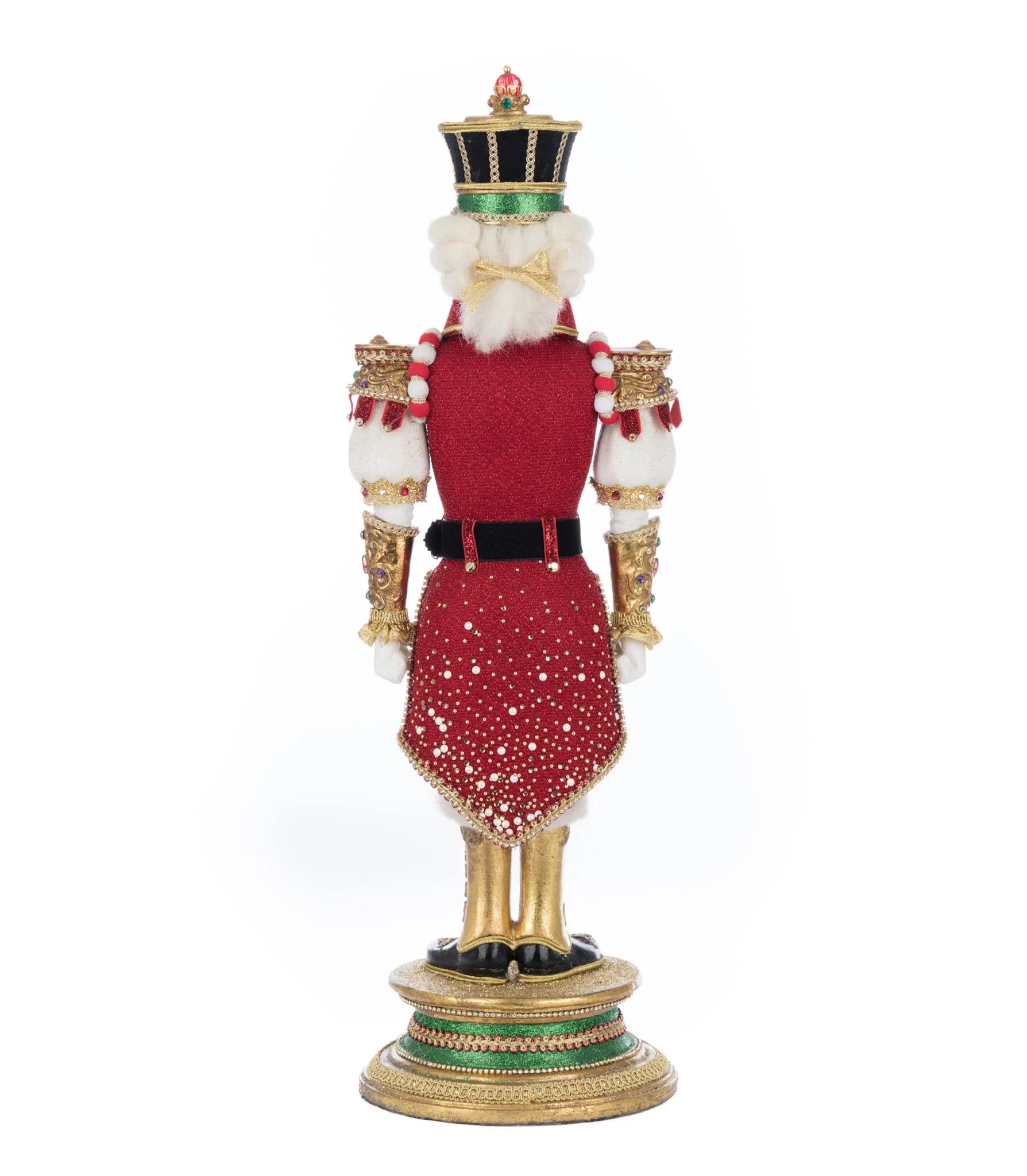 Commandant Pierson Pecan stands as a regal masterpiece of the Royal Christmas Ball. Handcrafted from sculpted resin, he is adorned in rich fur-lined luxurious fabrics, shimmering pearls, and exquisite hand-jeweled appliqués. Intricate gold leaf trim enhances his noble presence, ensuring he commands attention and admiration as the epitome of festive grandeur.