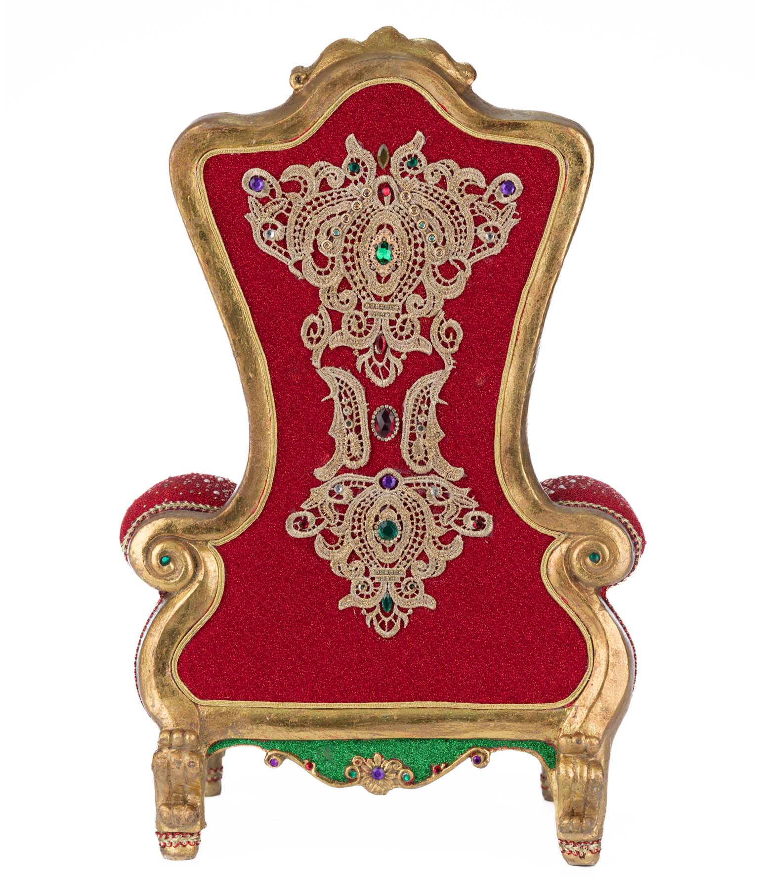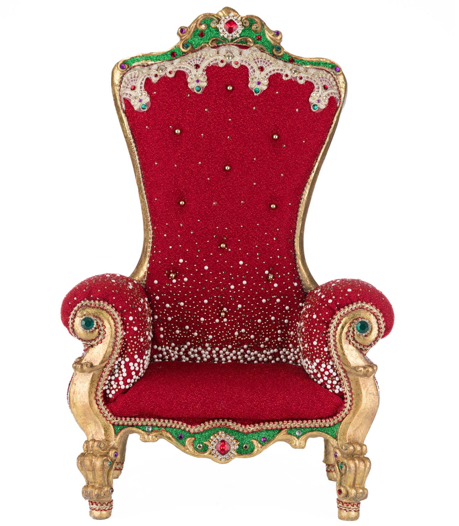 Santa’s throne for the Royal Christmas Ball is truly an opulent piece. It's stately frame is accentuated with shimmering gold leaf carvings and jewels. Upholstered in rich red fabric embellished with pearls, gold beads and beautiful golden appliqués with jewels, this handmade piece is truly fit for a king!